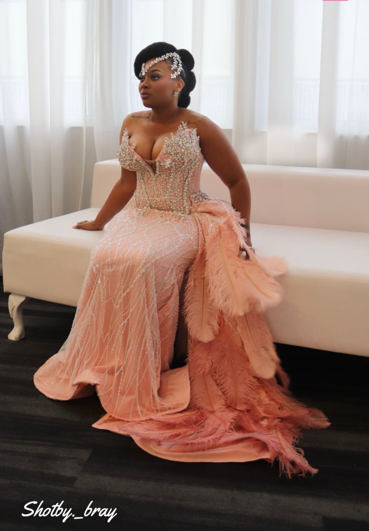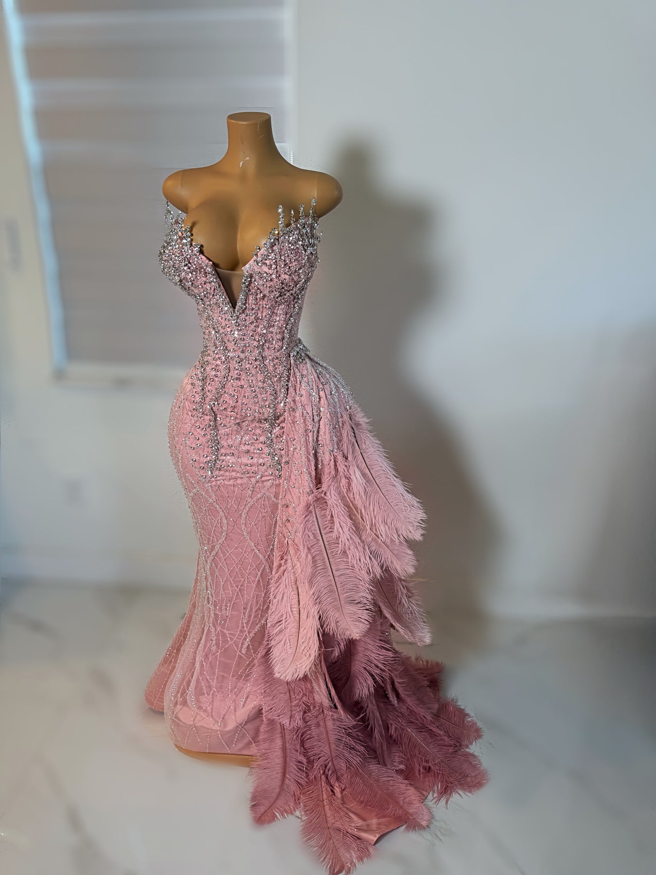 Flowing gracefully into a fitted mermaid skirt, Peppe is elevated with layers of luxurious ostrich feathers cascading down one side — a dramatic, feminine flourish that embodies timeless glamour. Designed for the woman unafraid to shine, this gown is perfect for galas, red carpets, or any unforgettable occasion.